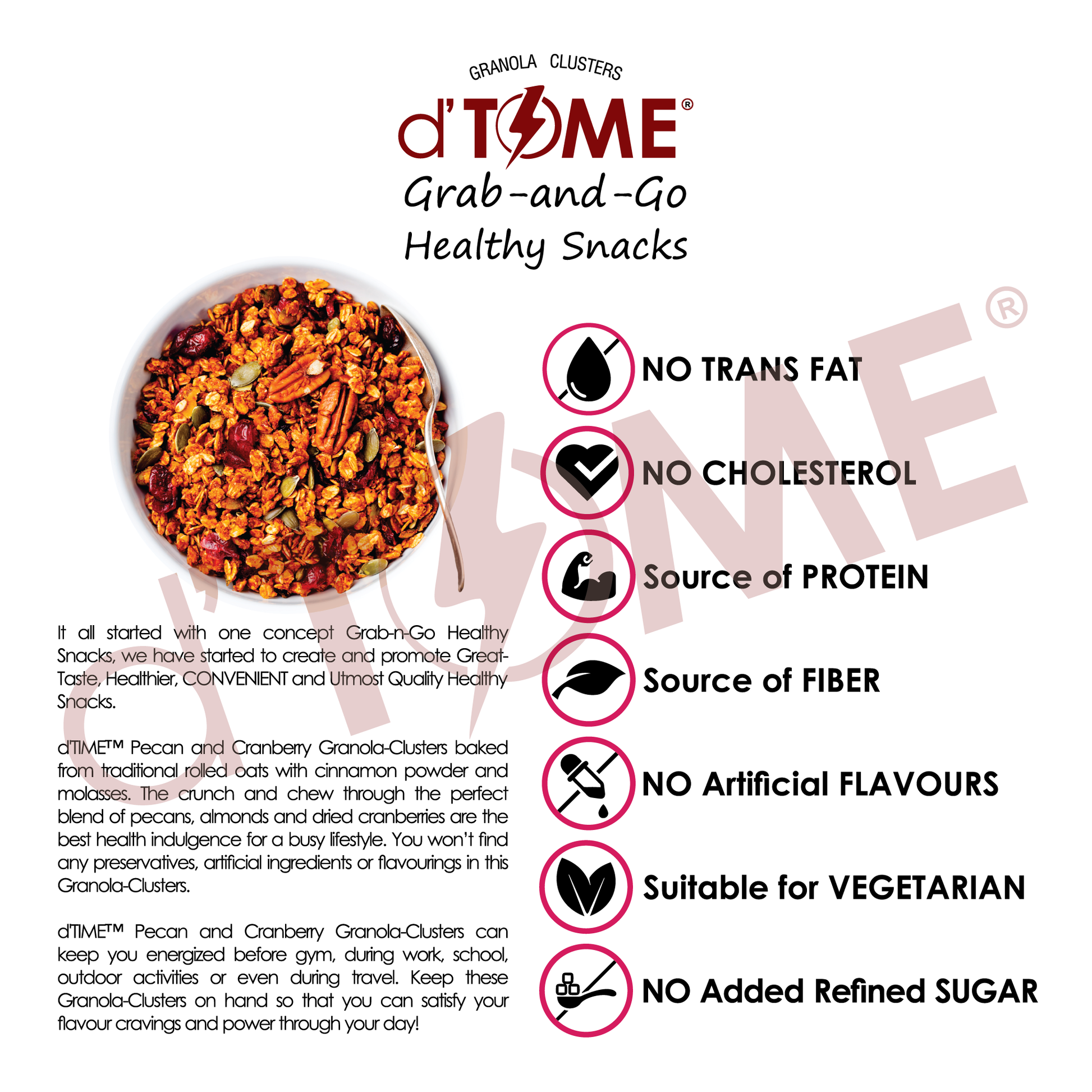 D’TIME Granola-Clusters are GMO Free, No Cholesterol & Trans Fat, Gluten Free, No artificial flavors or food colorants, Good source of protein, Excellent source of Fiber and Good source of minerals. It can be eaten for breakfast or as a midday snack, served over smoothies, yogurt or added into your favourite baked goods! You can also use granola for everything from granola bars to cookies to muffins for a boost of texture, flavor and wholesome nutrition. Having some good, wholesome granola on hand in the pantry is always a good idea for busy mornings.