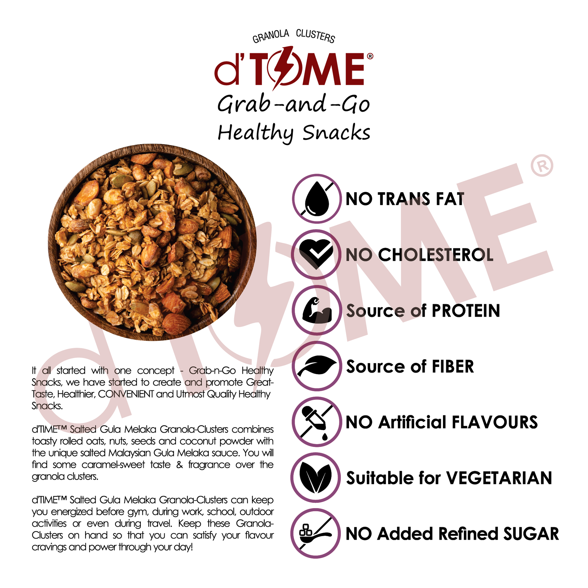 d'TIME Granola 混合了燕麦片、坚果、种子、干果和我们的特殊配方烘烤而成。 d'TIME 坚果麦片不含转基因,不含胆固醇和反式脂肪,不含麸质,不含人造香料或食用色素,它绝对是蛋白质的良好来源,纤维的最佳来源和矿物质。可以作为早餐或午间零食,搭配冰沙、酸奶或添加到您最喜爱的烘焙食品中!您还可以将d‘TIME坚果麦片用于制作麦片能量棒,饼干,松饼或其他烘烤食物中,以增加口味或口感。对于忙碌的早晨来说,d'TIME Granola 是您不可缺少的早餐, 因为它既方便携带又富有营养。
